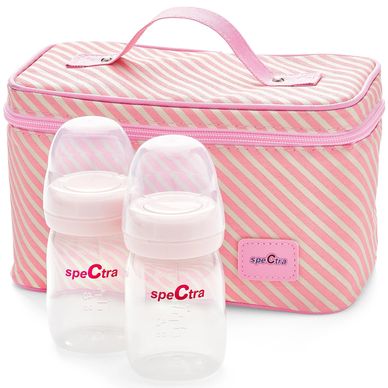 The Spectra Pink Cooler Kit contains a reusable Freezer Pack and an insulated lining to allow breast milk to be kept cold for extended periods of time. The cooler is equipped with a zipper closure and carrying handle. Each Spectra Wide Neck Bottle included in the Spectra Pink Cooler Kit is BPA-free and can store expressed breast milk for up to 1 day inside of the Pink Cooler with Freezer Pack. Contents include 1 Pink Cooler, 1 Freezer Pack, and 2 Spectra Wide Neck Storage Bottles with a cap, disc, and lid for each bottle.